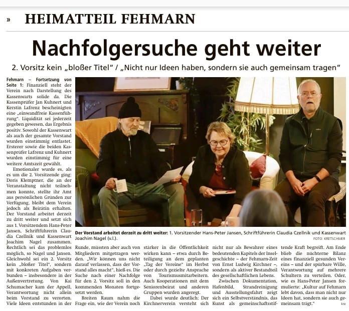 Für alle, die nicht dabei waren und für diejenigen von Ihnen, die das Fehmarnsche Tageblatt nicht täglich erhalten, haben wir in der Anlage den Artikel beigefügt und den Film des gesamten Neujahrsempfangs hier für Sie bereitgestellt. Wir danken Herrn Claus Küster für die Bereitstellung des Filmes und die damit verbundenen Arbeiten.